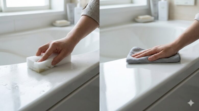 お風呂でメラミンスポンジを使うときは、「水だけで汚れが落ちる便利な道具」と考えるより、まず「表面を傷めないか」を先に見た方が安心です。特に浴槽・鏡・床・水栓まわりは、素材や表面加工によって傷、くもり、ツヤ落ちが起きることがあります。