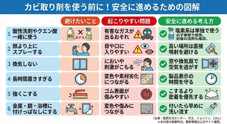 特に塩素系のカビ取り剤を使う場合は、安全確認も先に必要です。酸性洗剤・クエン酸・酢・アルコールなどと混ざると危険な場合があるため、落とし方より前に「やってはいけないこと」を見ておきましょう。