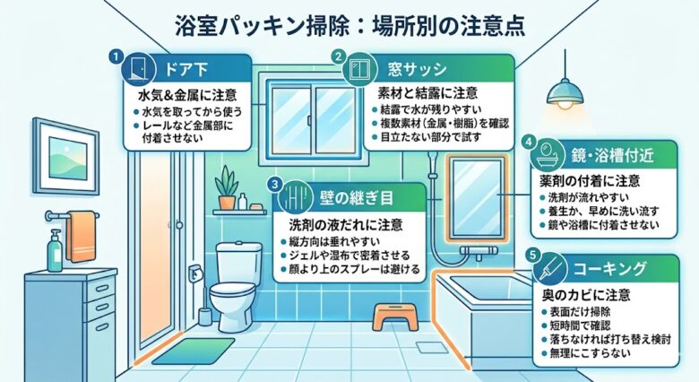 浴室ドアの下は、水がたまりやすく、パッキンの黒カビが出やすい場所です。同時に、レールや金属部が近いことも多いため、カビ取り剤が広がりすぎないよう注意します。