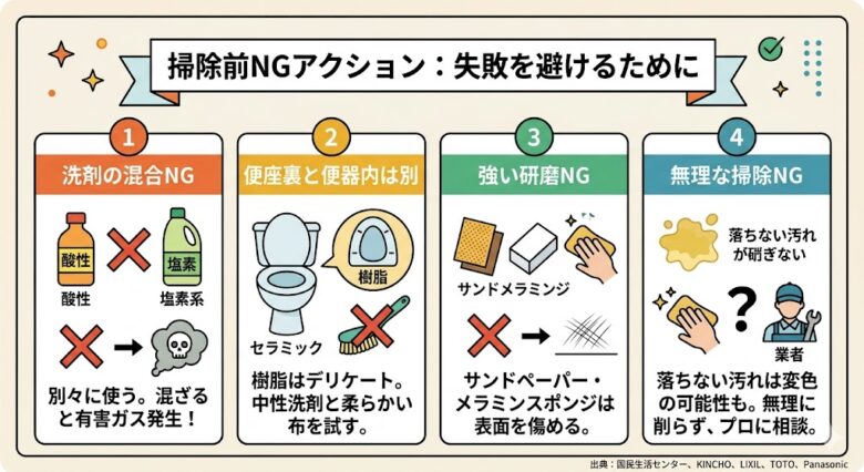 尿石かもしれないと思っても、いきなり強い洗剤や削る道具を使うのは避けたいです。特に酸性洗剤と塩素系洗剤の併用、素材確認なしの研磨、便座裏への強い洗剤は失敗につながりやすいです。