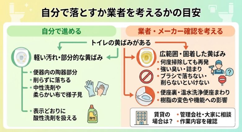 部分的な軽い黄ばみなら、自分で確認しながら進めやすいです。一方で、広範囲の固着、強い臭い、詰まり、素材を傷めそうな状態では無理をしない判断が安全です。