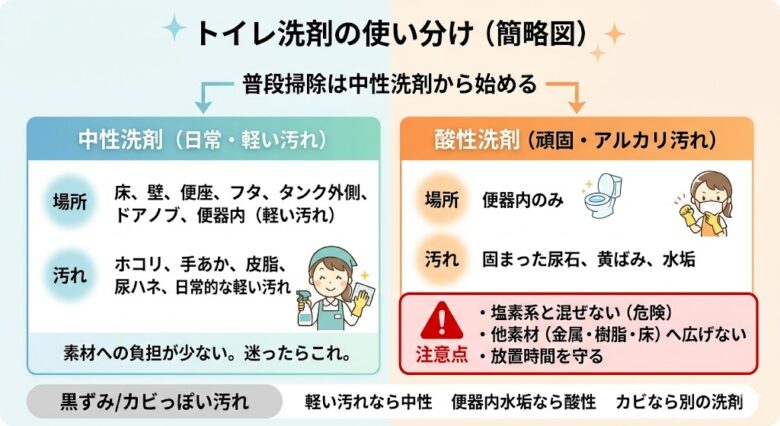 トイレ掃除では、普段の軽い汚れは中性洗剤、便器内の尿石・黄ばみ・水垢は酸性洗剤が候補になります。ただし、黒ずみやカビっぽい汚れは酸性洗剤だけで決めつけない方が安全です。