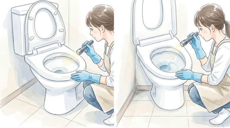| フチ裏 | 軽い汚れ | 尿石、黄ばみ | 便座や金属部に飛び散らせない |