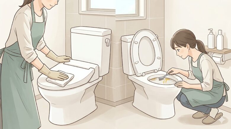 | 軽い黄ばみ | 中性洗剤で拭く、便器内はブラシで洗う | 酸性洗剤を部分使い | 便座や床の素材が傷みそう |